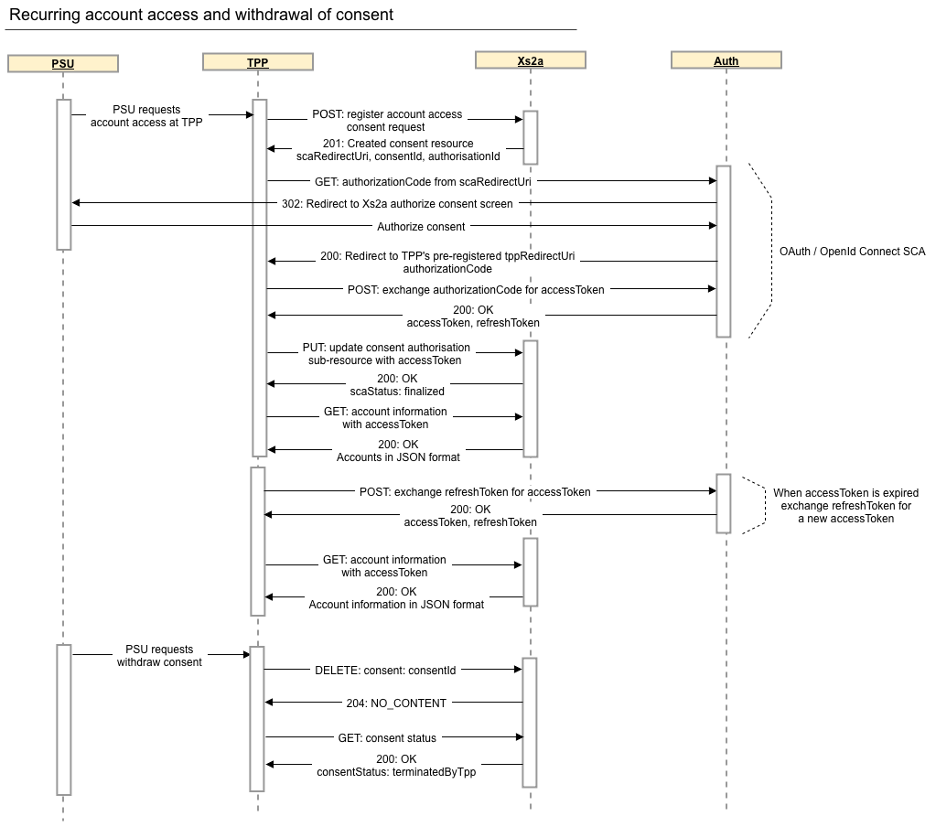 This Account Information Service flow implements the NextGenPSD2 "OAuth2 SCA Approach: Implicit Start of the Authorisation Process" for authorisation of the consent request.