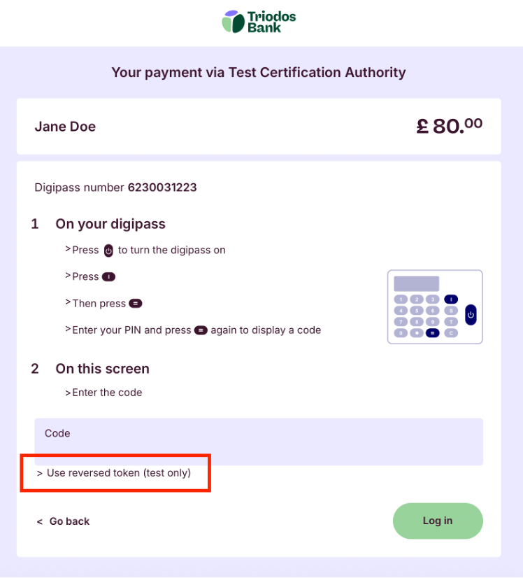 On the token login screen select the "Use reverse token (test only)" button below the input field to complete the authorisation process: